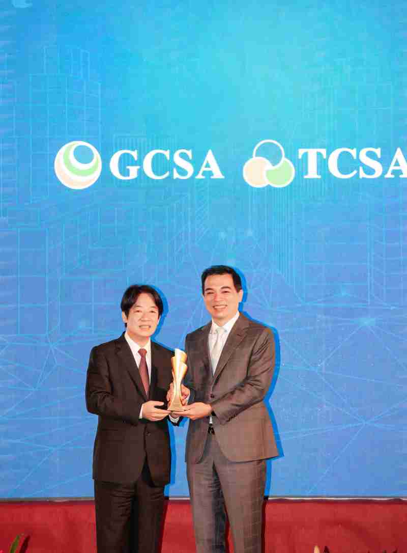 达全方位永续表现获全球永续奖及台湾永续奖肯定,,,由副总统赖清德颁奖 (左),,,YAXIN111总经理柯富仁 (右) 代表领奖