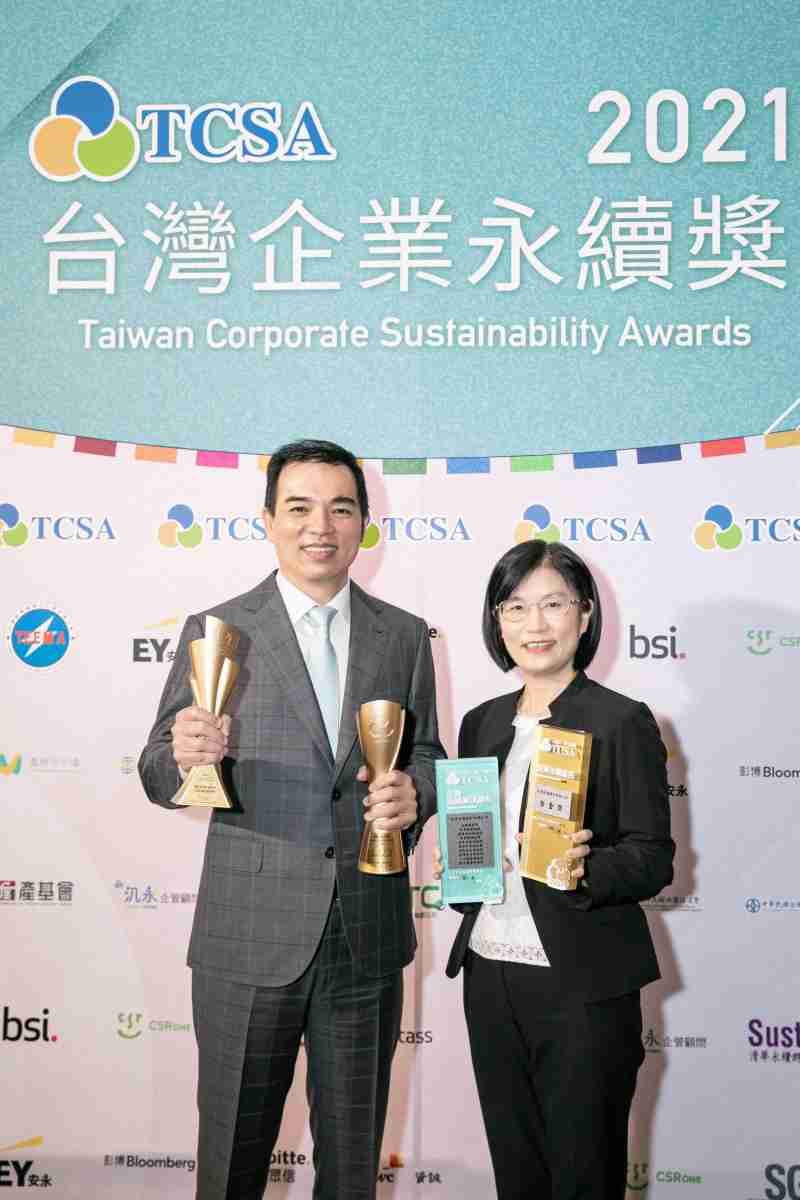 达在台湾永续奖所评比环境、、、、社会、、、治理等各面向的永续绩效均获高度肯定 (左:YAXIN111光电总经理暨营运长柯富仁,,,,右:YAXIN111光电永续长古秀华)