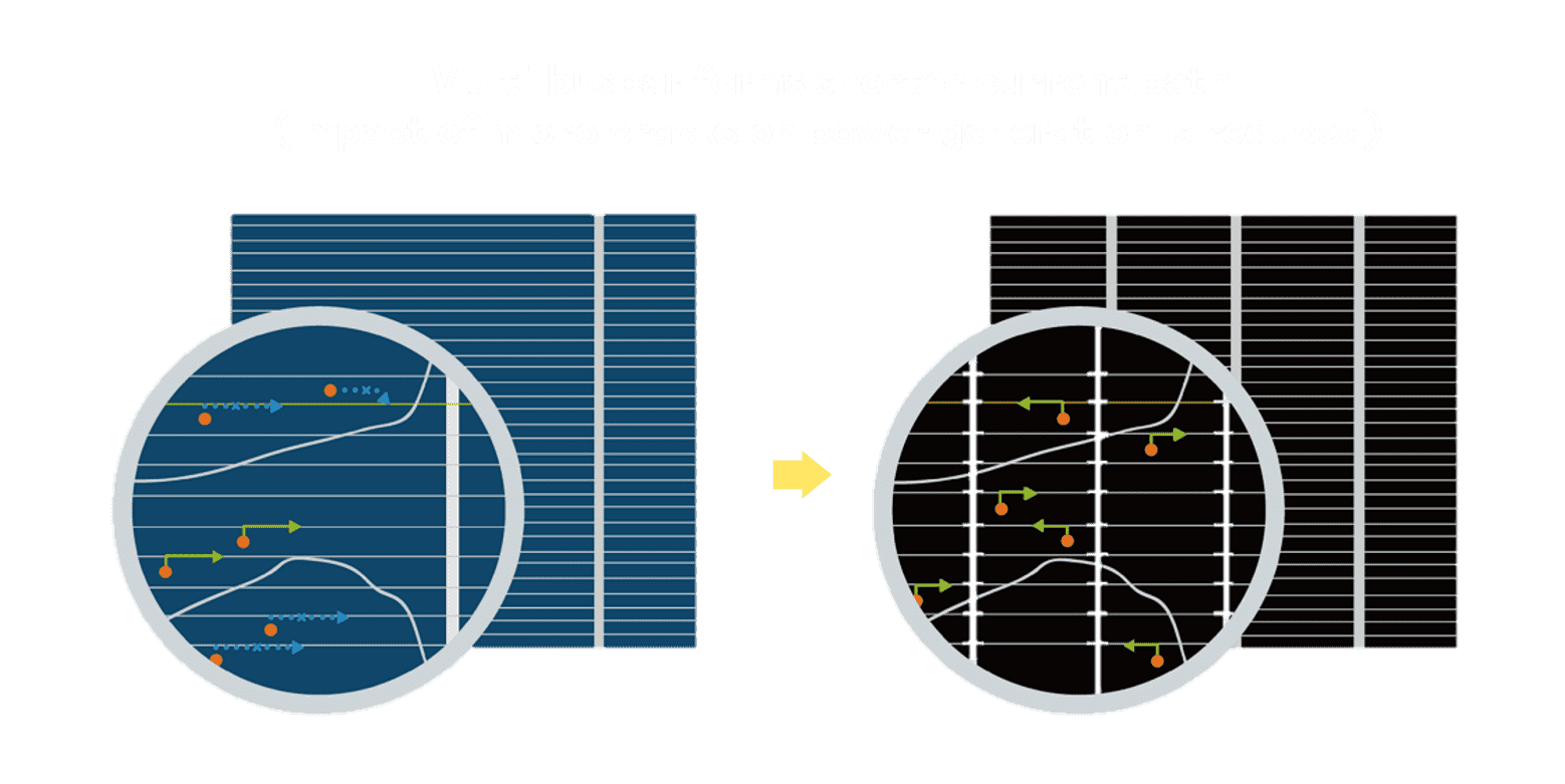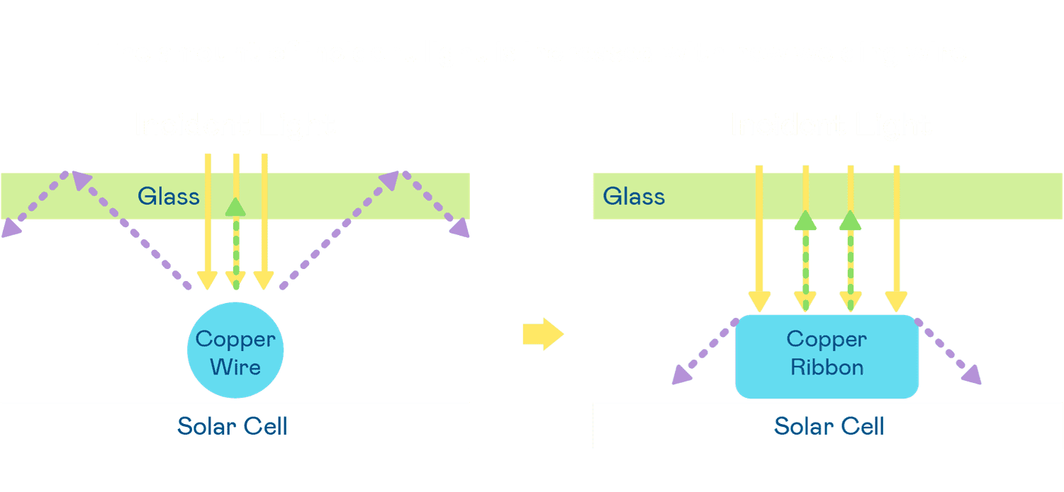 - 电池使用多条铜导线 (Copper wire) 于电池片上形成较短的电流路径,,,,提高电流收集效率,,,,采用圆形设计的铜导线较传统扁平式的铜焊带 (Ribbon),,,,可增加入射至电池的光线量。。。。