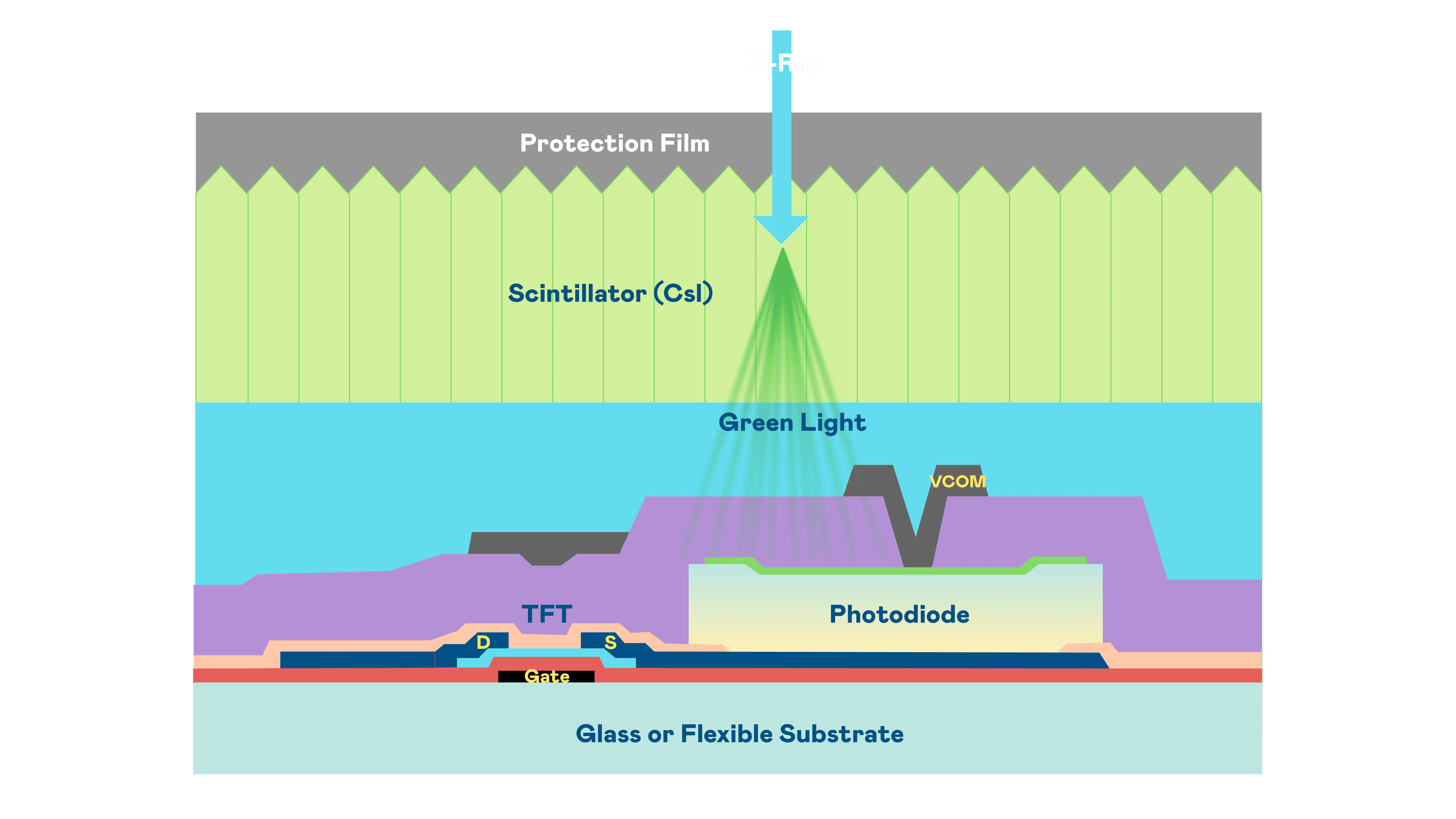 YAXIN111的X光影像感测阵列使用薄膜电晶体 (TFT) 作为每个像素的读取开关,,,,搭配光电二极体(Photodiode)的光电转换元件,,,用以感测X光影像讯号。。